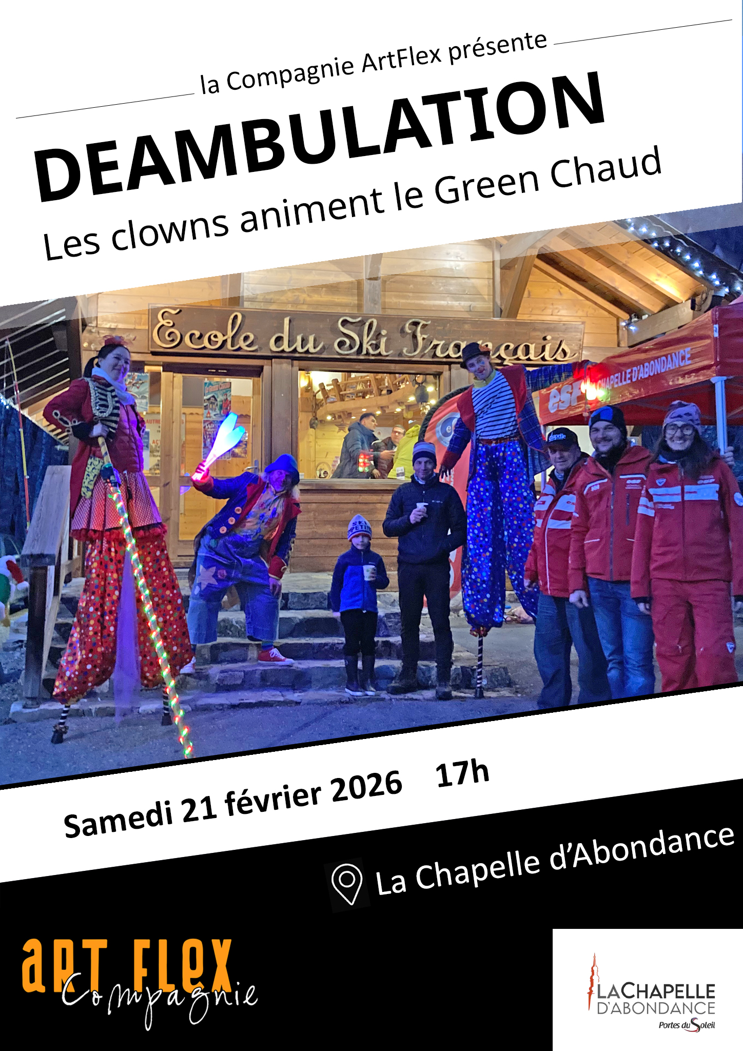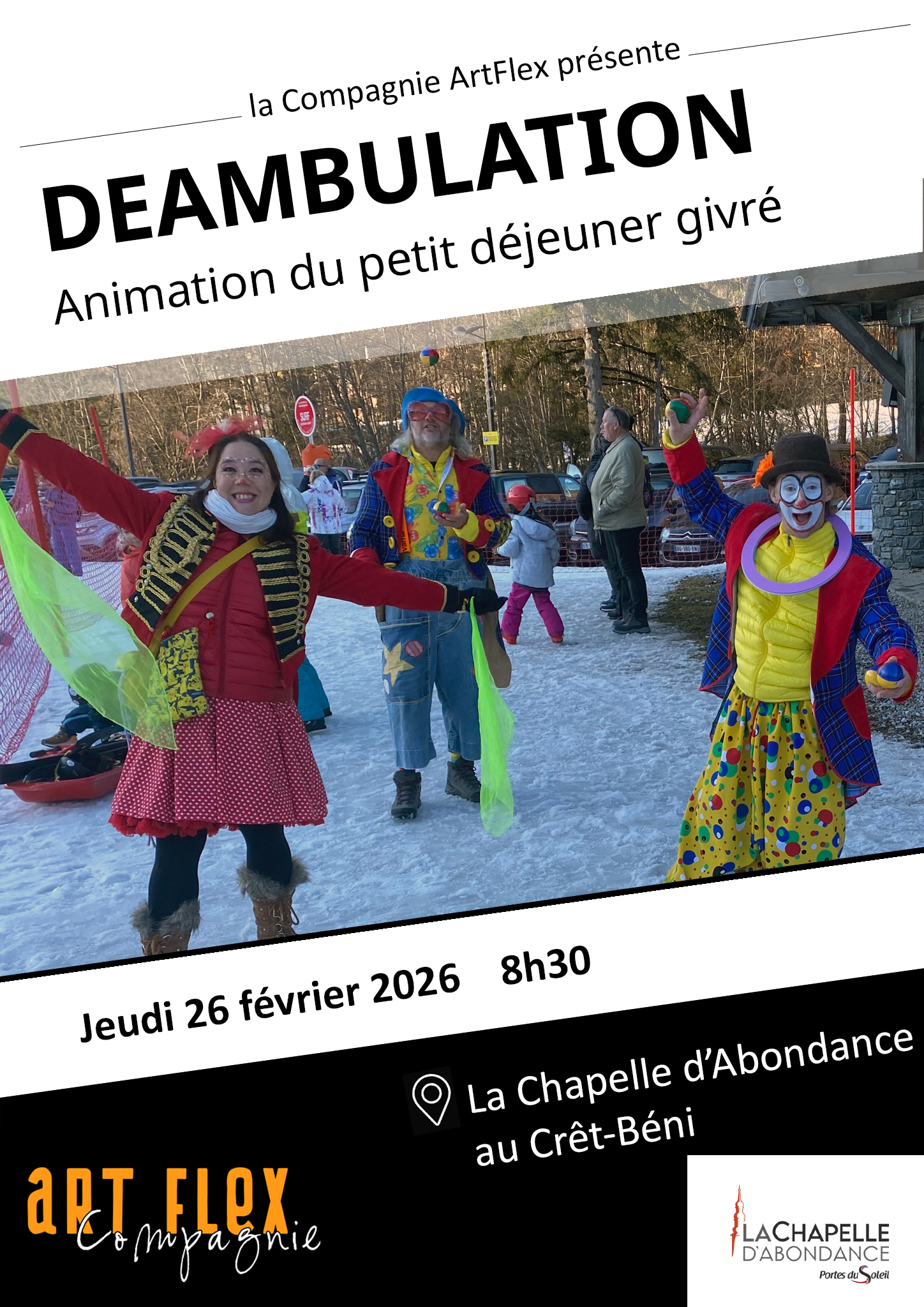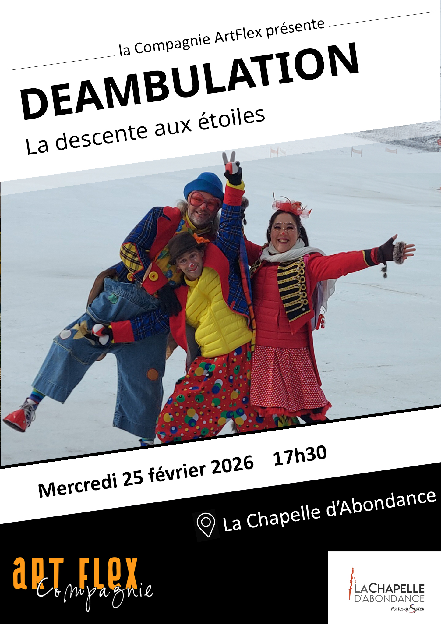Pour la 3e année, ArtFlex revient à la Chapelle d’Abondance et cette fois pour 2 semaines de spectacles et de déambulation dans les communes d’Abondance, de Bernex et même en Suisse !